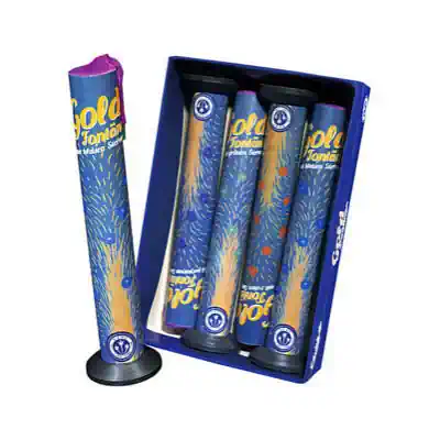 Sortiment aus Goldfontänen mit Farbsternen. Je eine Fontäne in rot, grün, violett und blau, stets kombiniert mit langbrennenden Goldfunken.